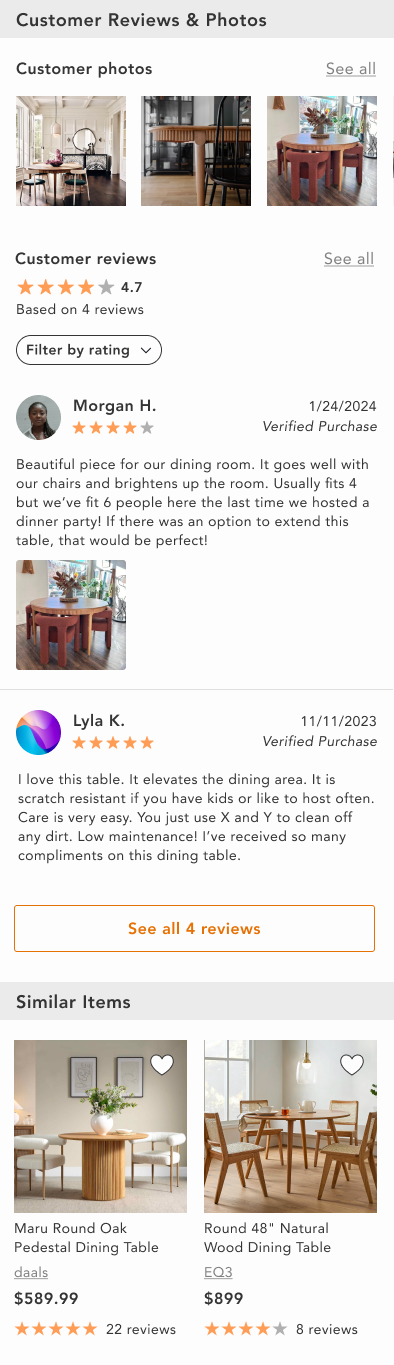 Test results showed that people find reading the reviews important and want to read both the pros and cons of a product. To offer in depth product research to users, I added a filter by rating feature so that users can sort through with more flexibility and without having to scroll through endless reviews.