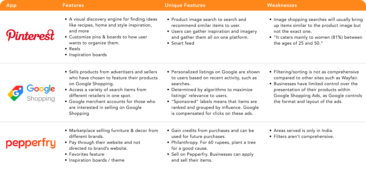 Initially, I believed my competitors would be other furniture stores, but upon closer examination, I recognized that the competition lay in the features rather than the products offered. They were sites that offer intuitive product discovery features such as Google Shopping, pulling products from different sites; and Pinterest, with their image search feature. Pepperfry, though a furniture website, offered features, such as furniture customization and merchant accounts, that could improve product discovery.