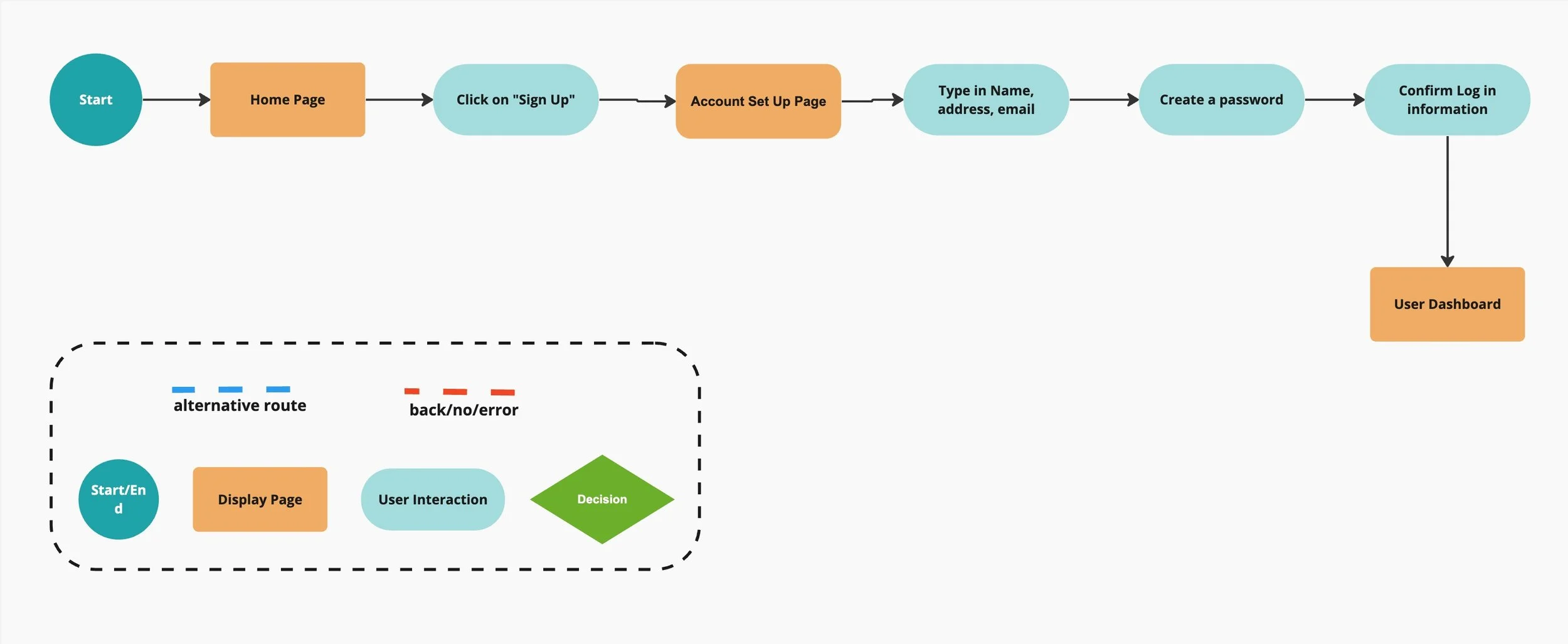 My wireframe focuses on the sign-up process. I wanted a familiar journey for the user and flexibility to make their save or finish the onboarding process easy.